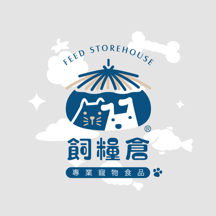 給毛小孩的極致寵愛,源自南台灣,主打安心、天然、美味的寵糧:飼糧倉專業寵物食品,飼糧倉象徵一座專為毛孩守護食安的倉庫,是讓毛孩安心的所在。品牌嚴選自天然食材,呼應房頂上稻穗的自然及滋養,更為凸顯品牌故事性。貓狗的線條簡潔,表情有著呆萌的期待與可愛,形成極具親和力的存在,也擔任了食安守門員的角色,建立與消費著的陪伴感;在食安品質的專業把關之下,主色用深藍搭配暖米色,更顯生活感、台灣土地的溫度,安心、可靠又溫柔。