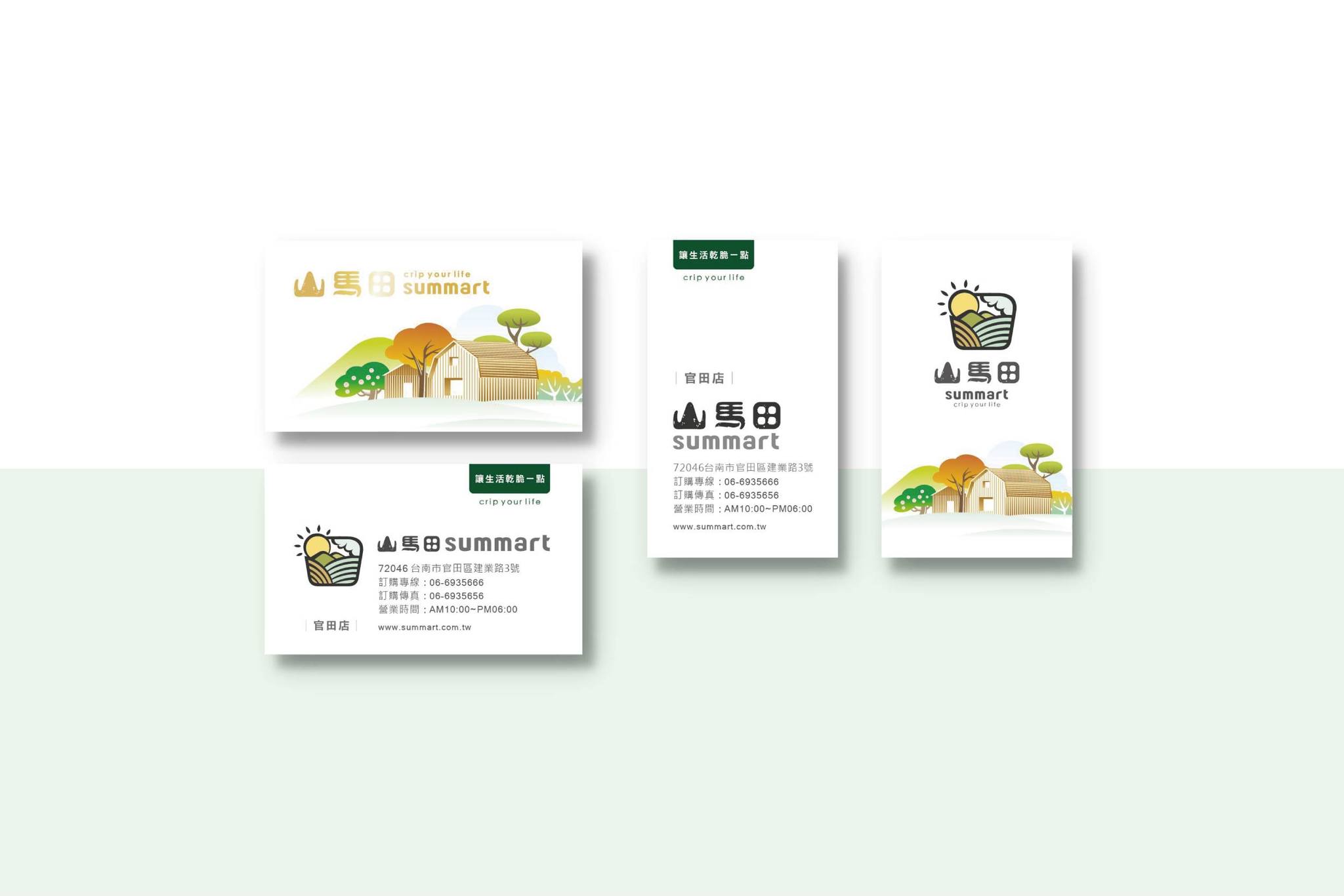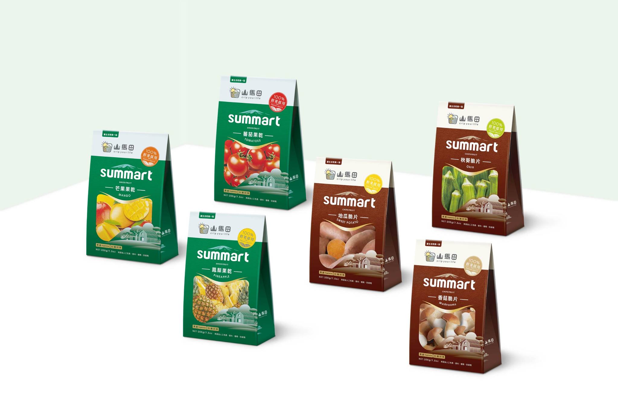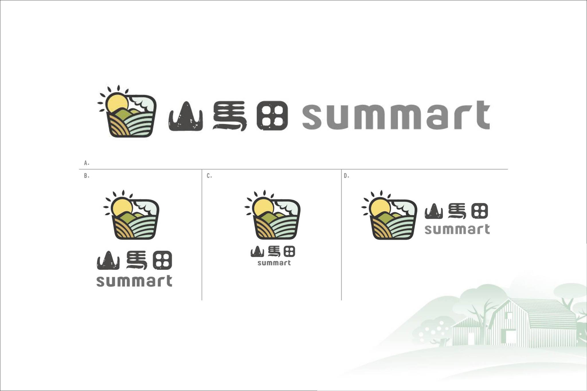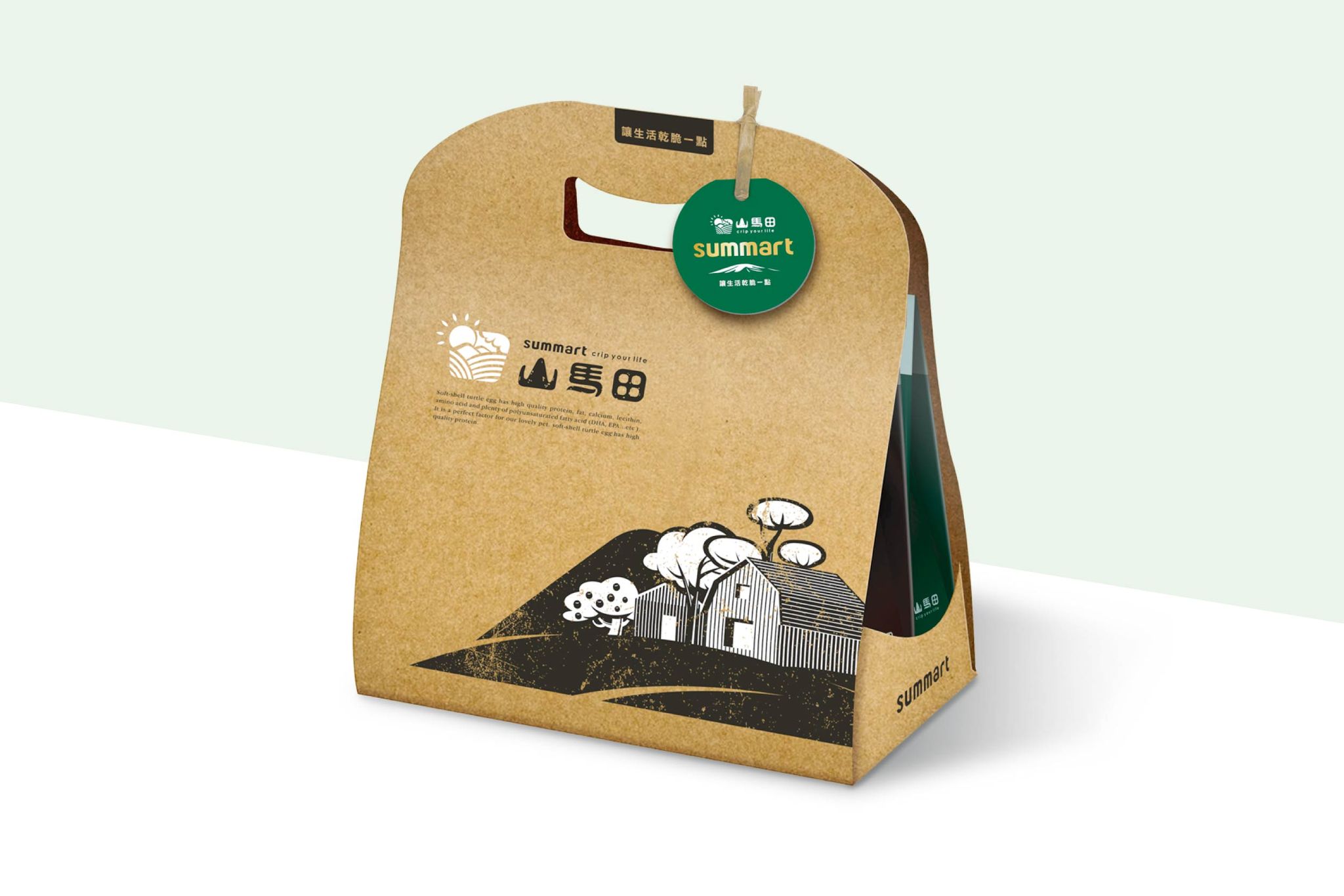 「山馬田」取其音同英文單詞Summer,摘取自其中的物產,轉化成像個超市mart的購物詮釋。LOGO標誌以山、日、田等自然生活意象構成,將土壤的層理、日照的溫度、耕者的節奏,濃縮在一個簡約而溫潤的符號之中。圖層整體彷彿能想像農場的四季如春、被折疊且細心收藏著窗外風景,傳遞出農作日常都在你我的生活裡。品牌標誌設計外形猶如果籃造型,猶如包裹著時節新鮮的美味,穩重且樸實的手寫標準字,更將台灣山明水秀的環境融入其中;低飽和度的大地色系,圓潤等粗的線條描繪,曲線和分層的起伏堆疊,營造出簡單、內斂、保有層次又具質樸的生活質感。