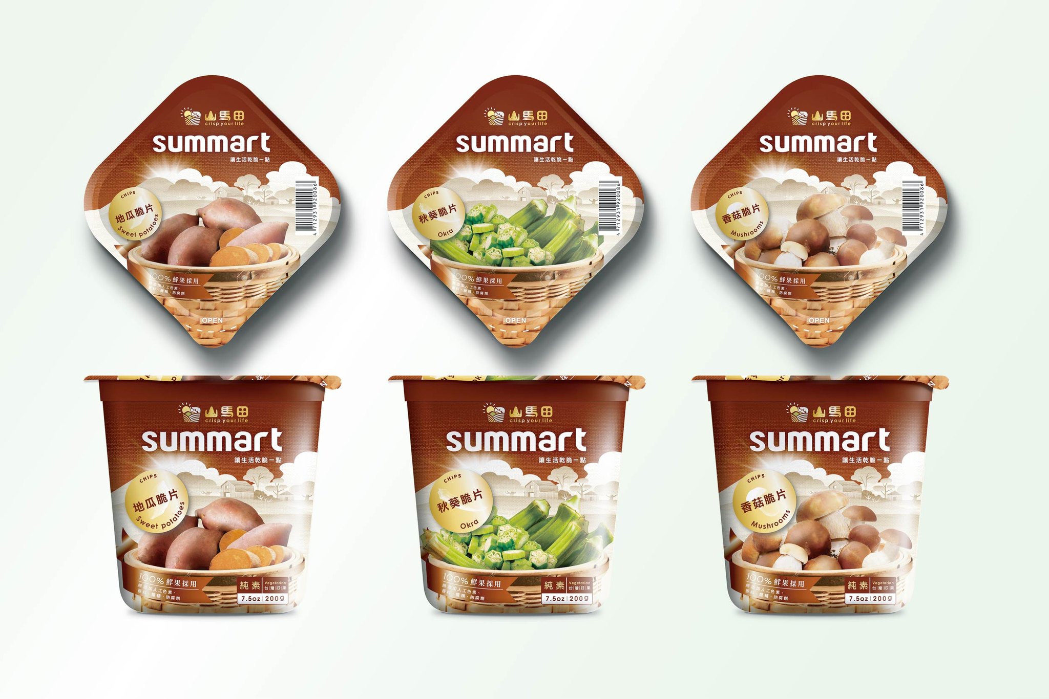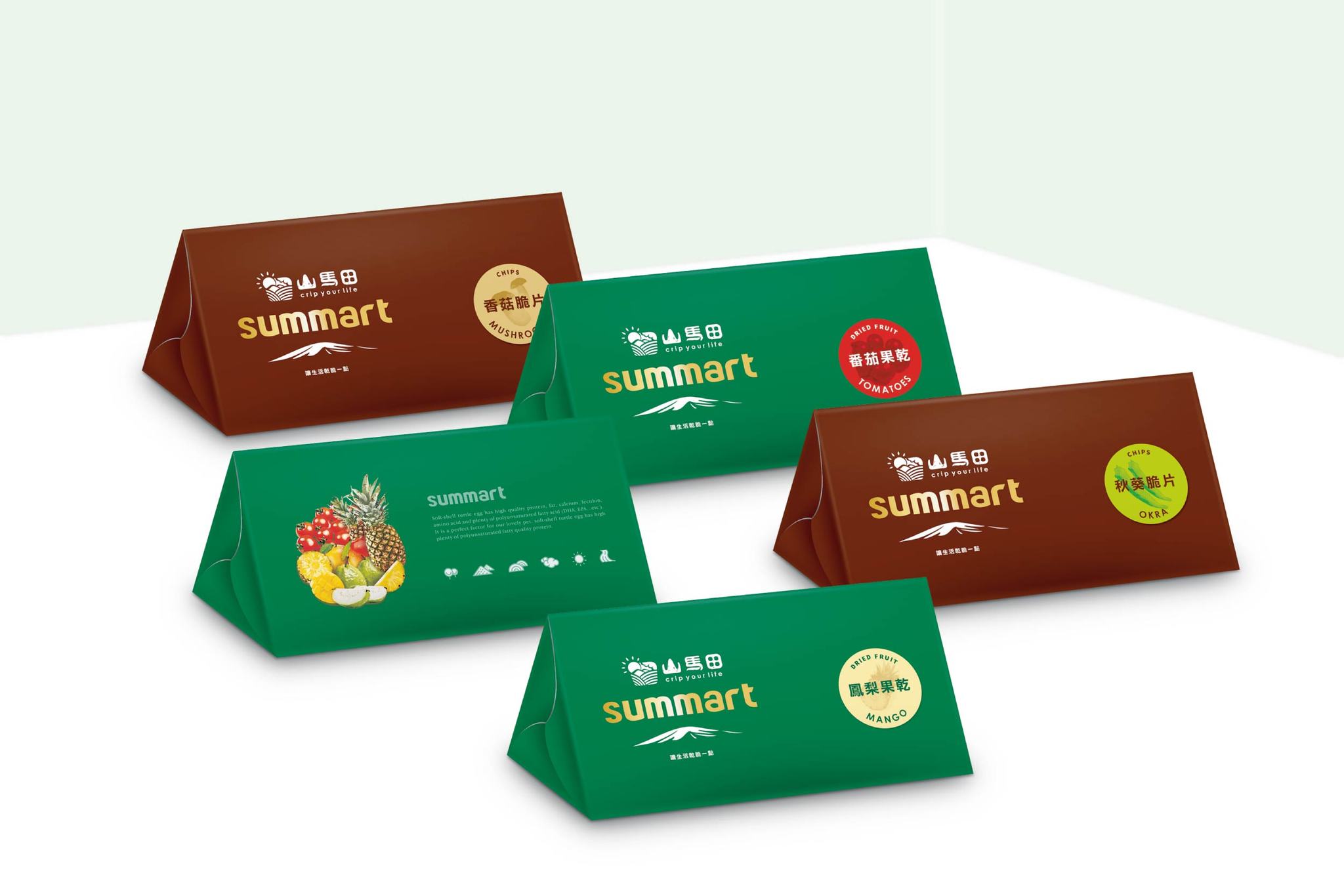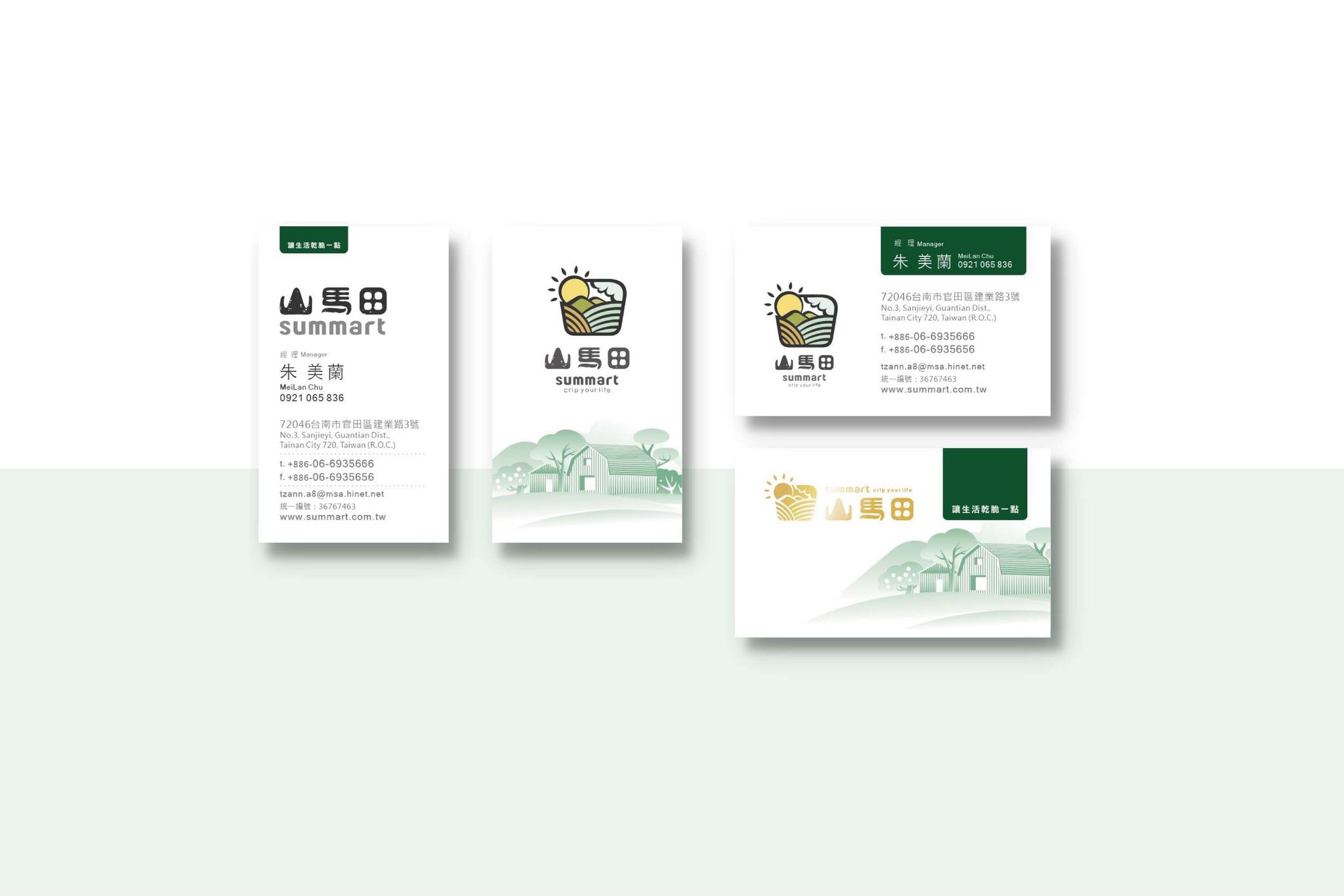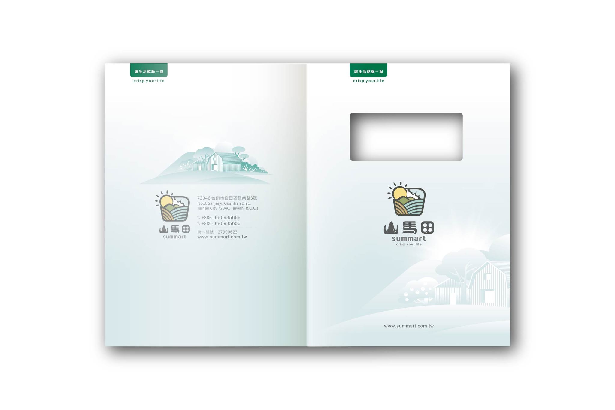 「山馬田」取其音同英文單詞Summer,摘取自其中的物產,轉化成像個超市mart的購物詮釋。LOGO標誌以山、日、田等自然生活意象構成,將土壤的層理、日照的溫度、耕者的節奏,濃縮在一個簡約而溫潤的符號之中。圖層整體彷彿能想像農場的四季如春、被折疊且細心收藏著窗外風景,傳遞出農作日常都在你我的生活裡。品牌標誌設計外形猶如果籃造型,猶如包裹著時節新鮮的美味,穩重且樸實的手寫標準字,更將台灣山明水秀的環境融入其中;低飽和度的大地色系,圓潤等粗的線條描繪,曲線和分層的起伏堆疊,營造出簡單、內斂、保有層次又具質樸的生活質感。